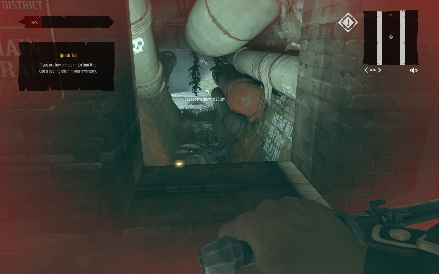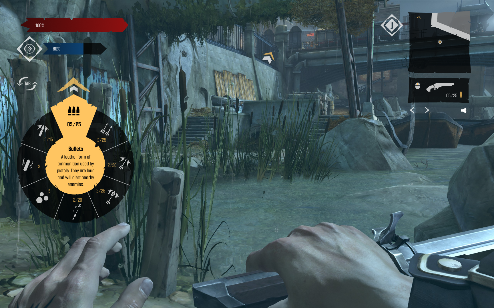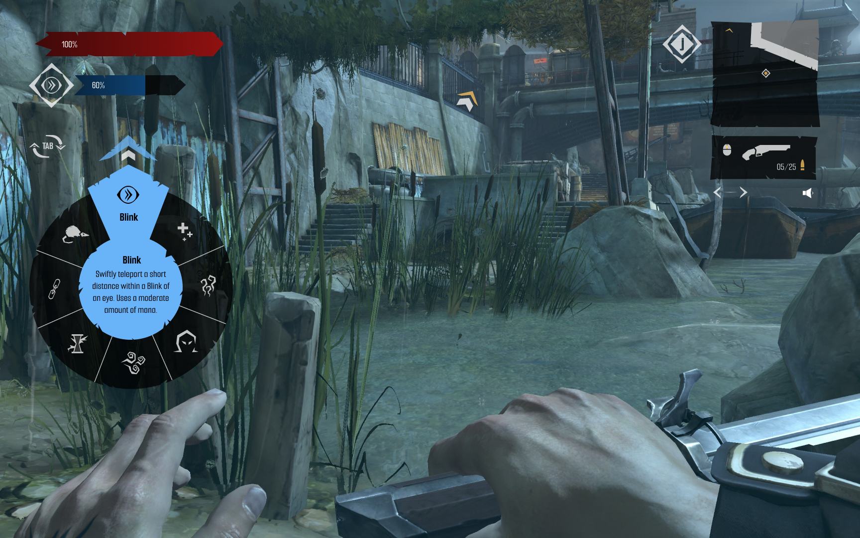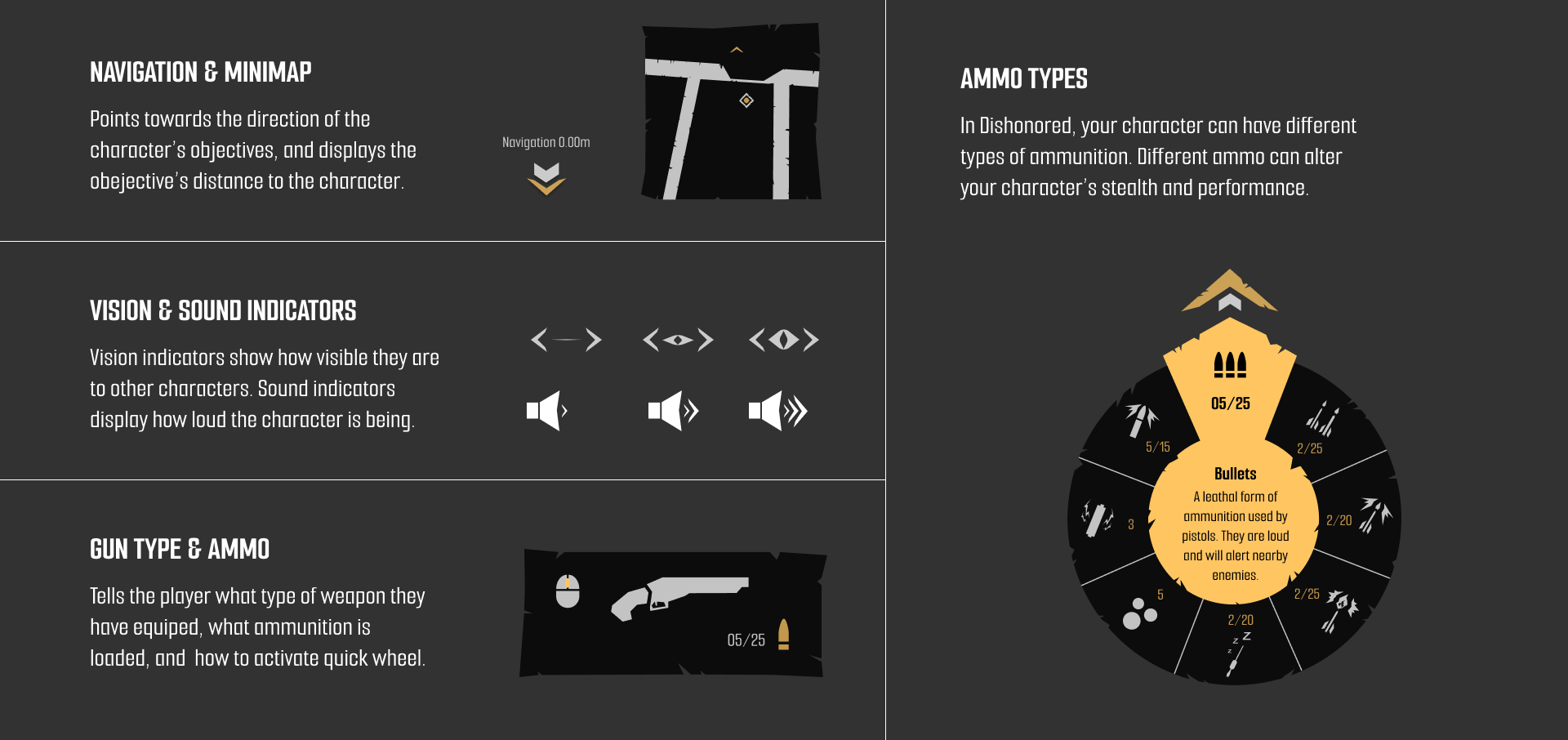 After months of work, I was able to finalize the UI components of Dishonored’s heads-up display and tailored the experience to new players. The components redesigned and implemented were the: health bar, mana bar, navigation and mini map, weapon display, primary and secondary tutorial pop-ups, objectives, interaction indicators, sight and sound indicators, and quick-wheels.