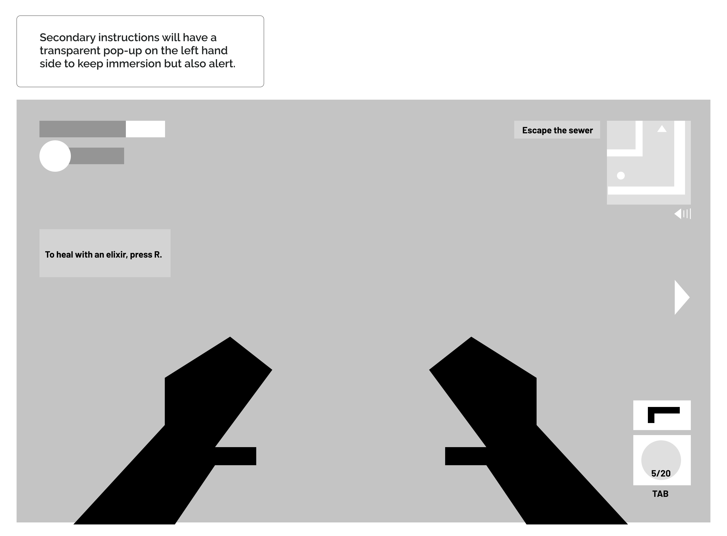 Due to confusion in the prototyping stage, I decided to add in a slight red glow when the player’s health began to decrease. Next to the mana bar, I also added an icon that would correlate to different abilities in their abilities wheel.